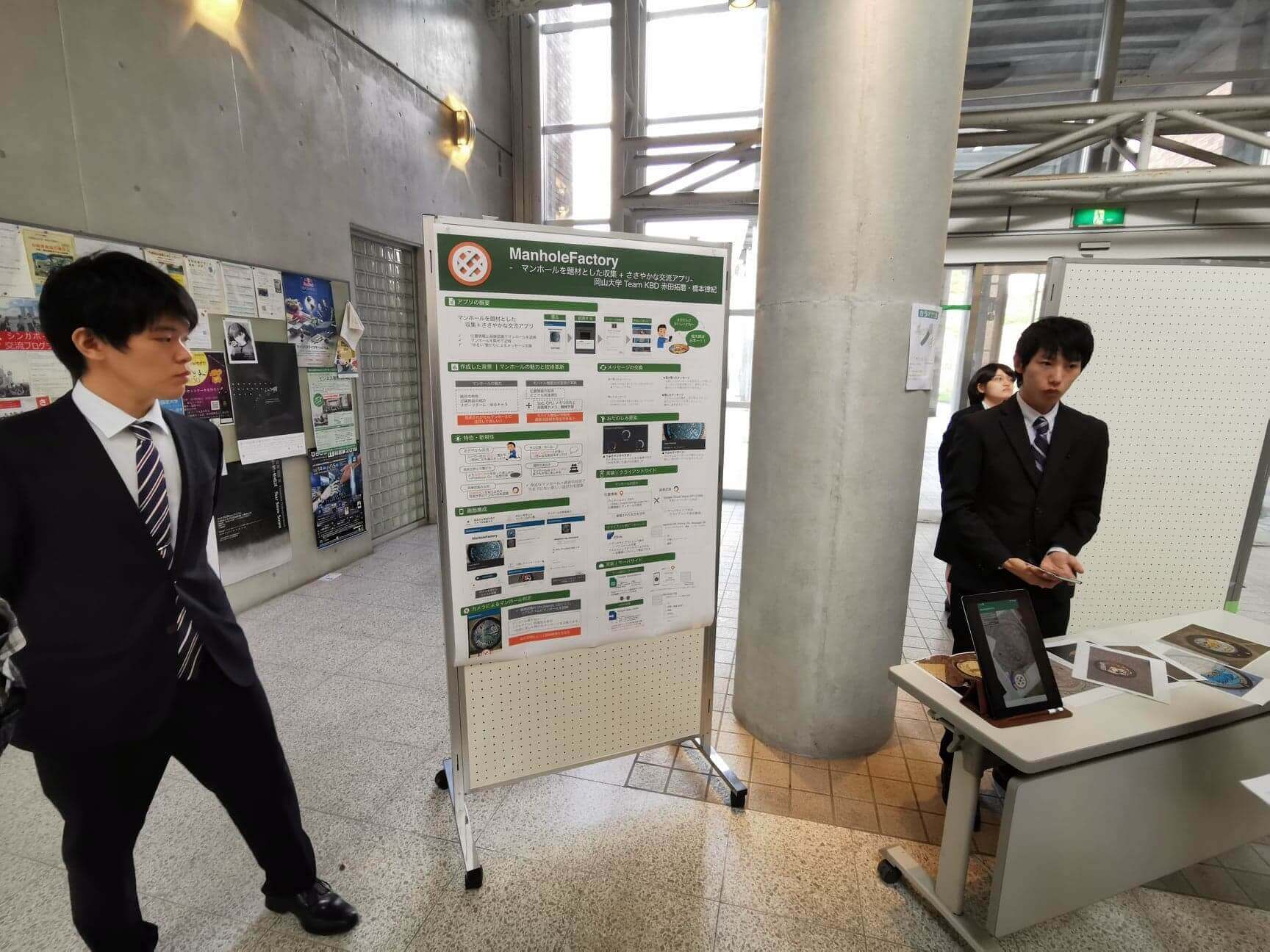 今年の作品部門で最優秀賞/総務省中国総合通信局長賞に選ばれたのは、岡山大学から二人組で応募されたチーム「KBD」の赤田拓磨さん、橋本律紀さんの作品「ManholeFactory」。マンホールを題材としたデータ収集と”ささやか”な交流ができるアプリというものです。マンホールというマニアックな着眼点がユニークです。