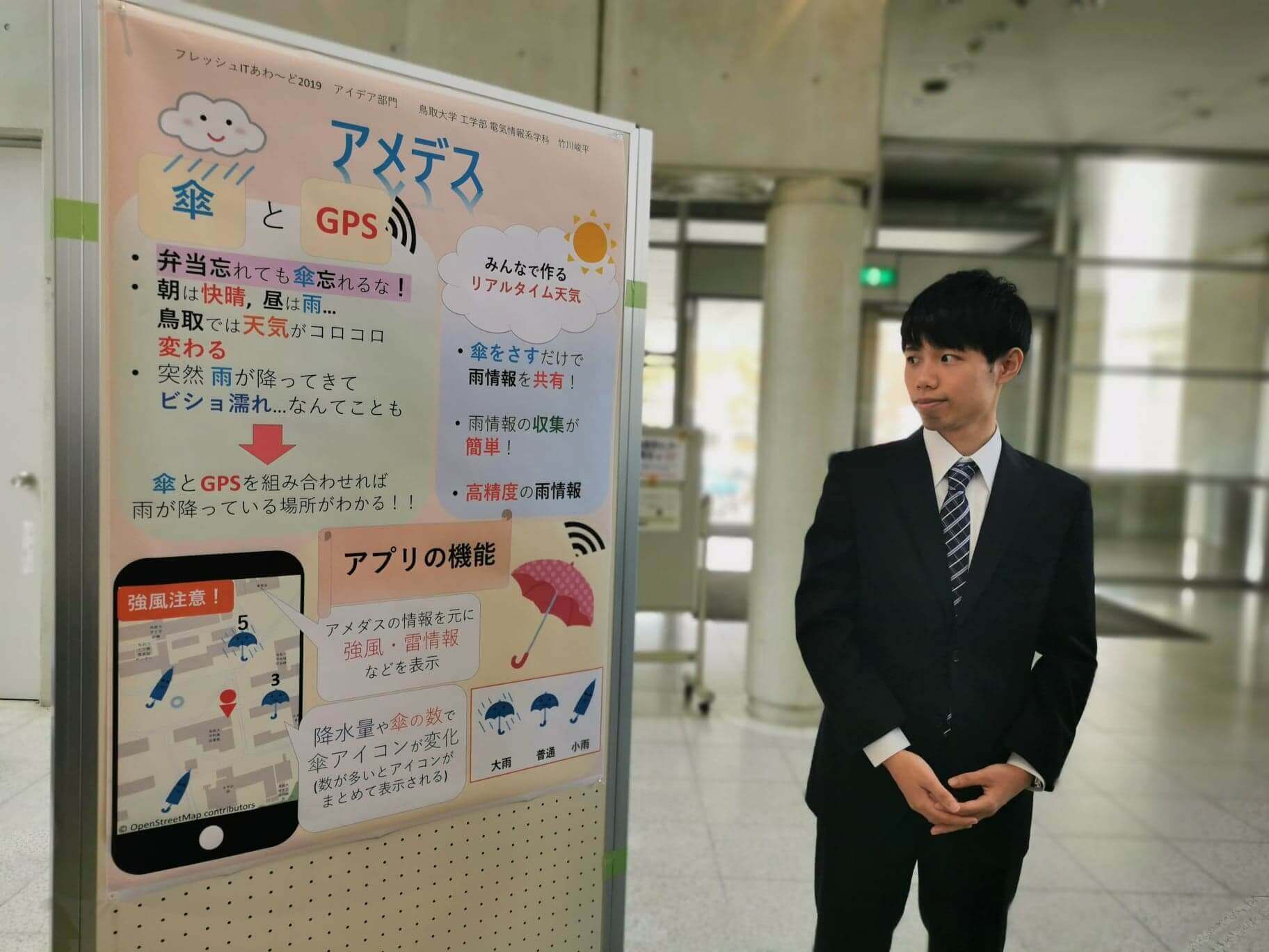 また、このほかにも、アイデア部門で優秀賞に評価された鳥取大学・竹川峻平さんの「アメデス」というアイデアは、傘にGPSと開閉センサーを装着することで、傘の利用状況から雨が降っている正確な位置やその量を共有できるというもの。じつは審査を担当された先生からは傘を使っている側のメリットが薄いのではといった指摘もされていたのですが、筆者はなかなか良いアイデアと評価しました。
