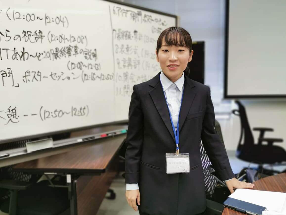 このほかにも魅力的なアイデアに満ちたアワードですが、このイベントは創設当初から電子情報通信学会に加入する中国地方の学生会員が役員となり、これに学生会顧問を務める大学教員が協力し運営されてきました。今年の多数の学生会スタッフを取りまとめ、このイベントのトップとして仕切ったのは広島市立大学大学院情報科学研究科修士2年生の長谷弘美さん。イベント終了後、一言コメントをいただきました。