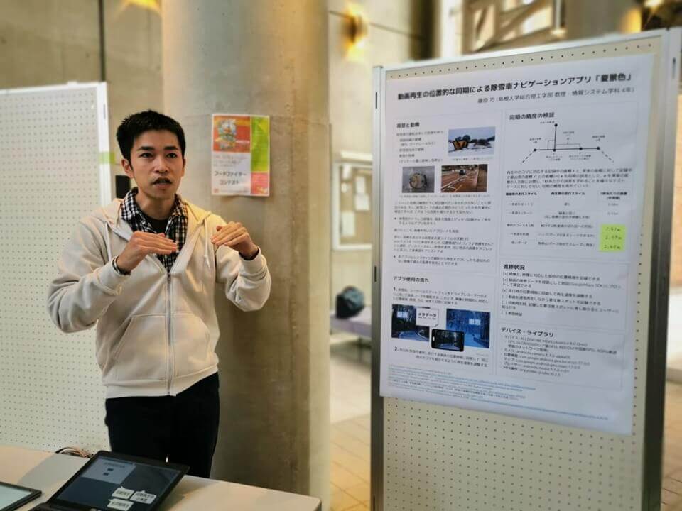 このほか、作品部門で優秀賞に輝いた島根大学・藤原巧さんの作品「動画再生の位置的な同期による除雪車ナビゲーションアプリ・夏景色」も大変有益なアプリだと感じました。豪雪地帯における除雪作業は、雪で道路上の様々なモノ(マンホールだとかポールだとか)が見えないため、これが除雪の際にトラブルの元になっていることを指摘。そこで除雪コースの夏景色の動画をあらかじめ蓄積し、除雪時にはその道路の夏の景色を参考情報として活用しようというものです。除雪車の走行中の位置情報をもとに、その場所の夏景色を同期させてディスプレイ上に表示させることで、雪に埋もれている障害物などを予見することができます。